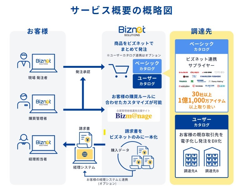 ビズネットはこうした課題を、独自のデジタルカタログによる購買管理プラットフォームを提供することで解決しようとしている。岡野氏はその概要について説明する。「当社が提供する購買管理プラットフォームの特徴は、まずお客さまのITリテラシーに関係なく、どなたでもお使いいただける直感的なサービスになっていることです。複数のサプライヤーとデジタル接続することで、まるでECサイトでオンラインショッピングをしているような感覚で、備品などを購入できます。また、既存の取引先企業の商品やお客様の指定購買品も購買管理プラットフォームに入れて一元管理する機能もございます。このように、窓口を一つに集約して請求までを一本化することで、購買管理の全てが可視化され、最適化できるサービスになります」