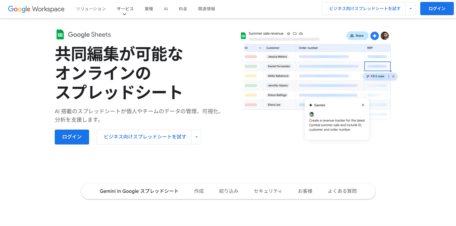 Googleスプレッドシート 1ファイル上限:1,000万セル/同時編集:最大100人(目安) なし(Apps ScriptやMarketplaceアドオンで拡張可) 日本語UI/無料はヘルプ・コミュニティ中心、Workspace契約でサポート Apps Script・アドオン・Connected Sheets(BigQuery)/Workspace有料プランへ移行