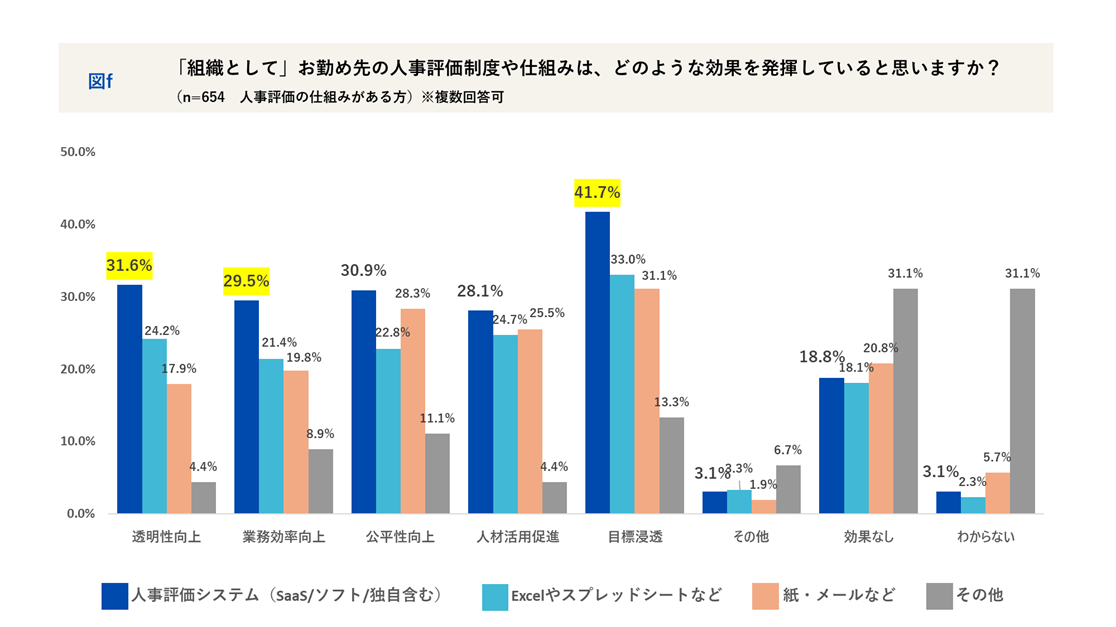 紙やメールベースでの評価と比べると差はさらに大きく、専用のデジタルツールの導入が組織運営に確かなメリットをもたらしていることが浮かび上がっています。