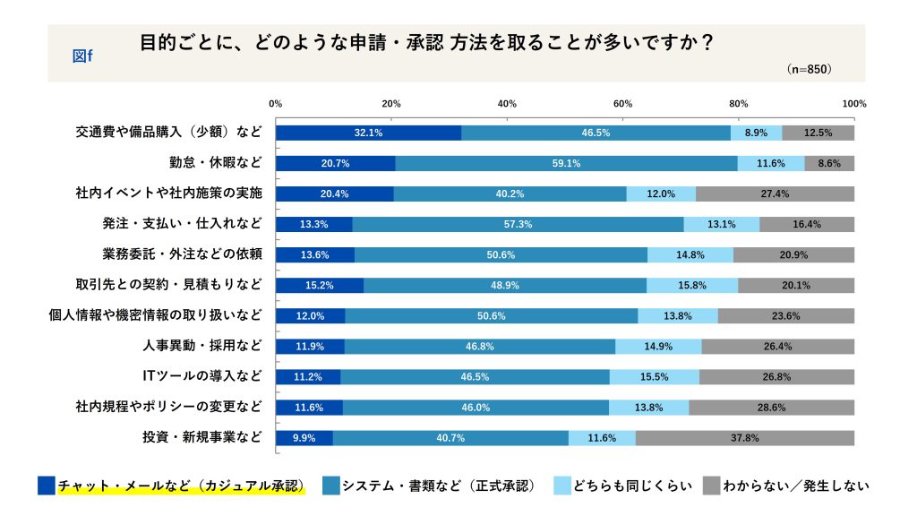 一方で、「発注・支払い」「契約」「外注」など、社外との取引を伴う領域では正式な手続きが6割前後を占めました。“チャット承認”はスピードを求める現場に根づきつつも、金銭や契約が絡む瞬間に“正式”へ切り替わる。企業が重視する線引きが、ここに表れています。