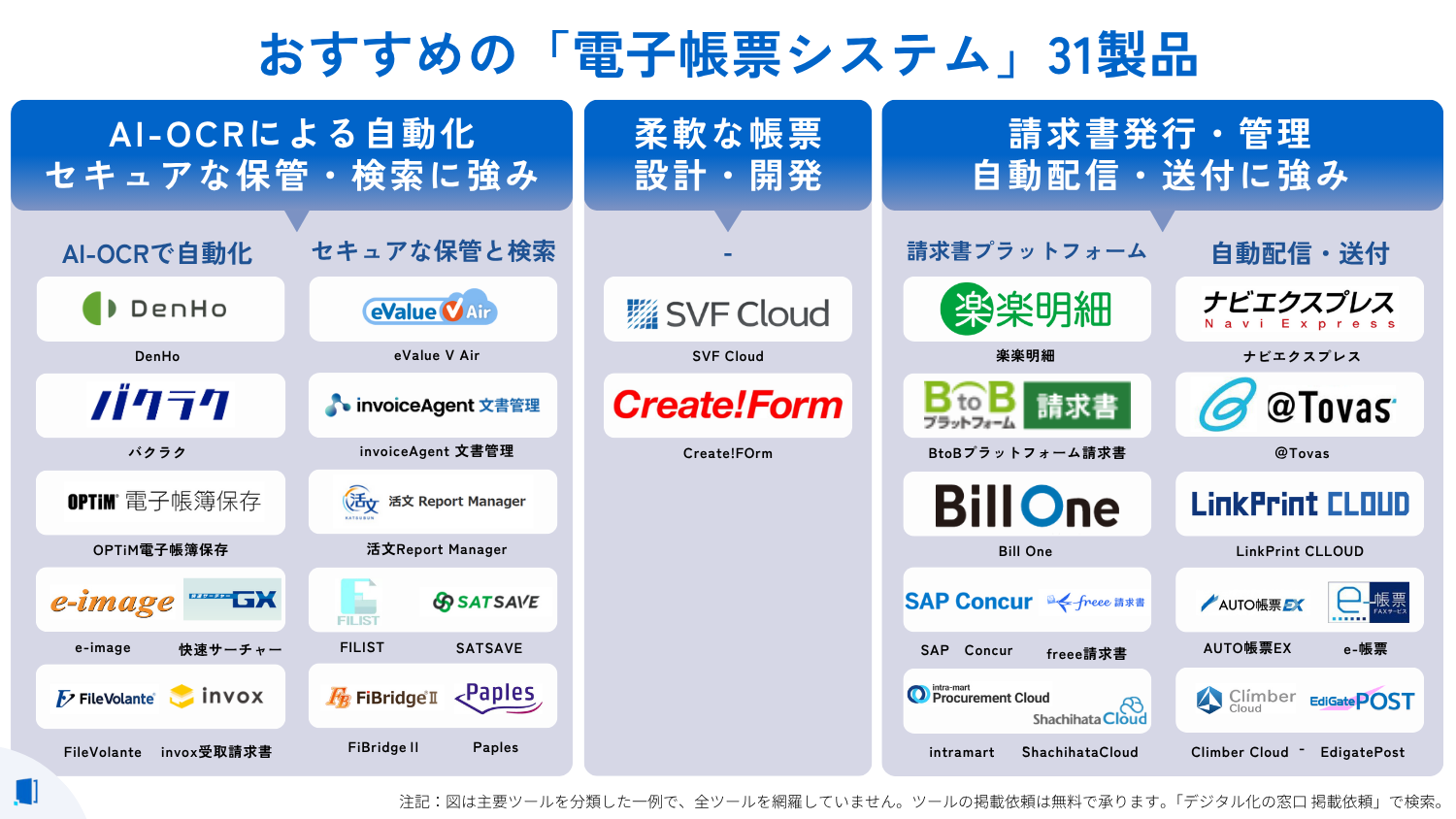 請求書、注文書、納品書、お届け明細書など、従来「紙」でやり取り・保管していた帳票を、電子データ(PDFなど)で作成、送受信、保管、管理するシステムの総称です。電子帳簿保存法への対応、郵送コストや保管スペースの削減、手入力作業の自動化(業務効率化)を目的として導入されます。