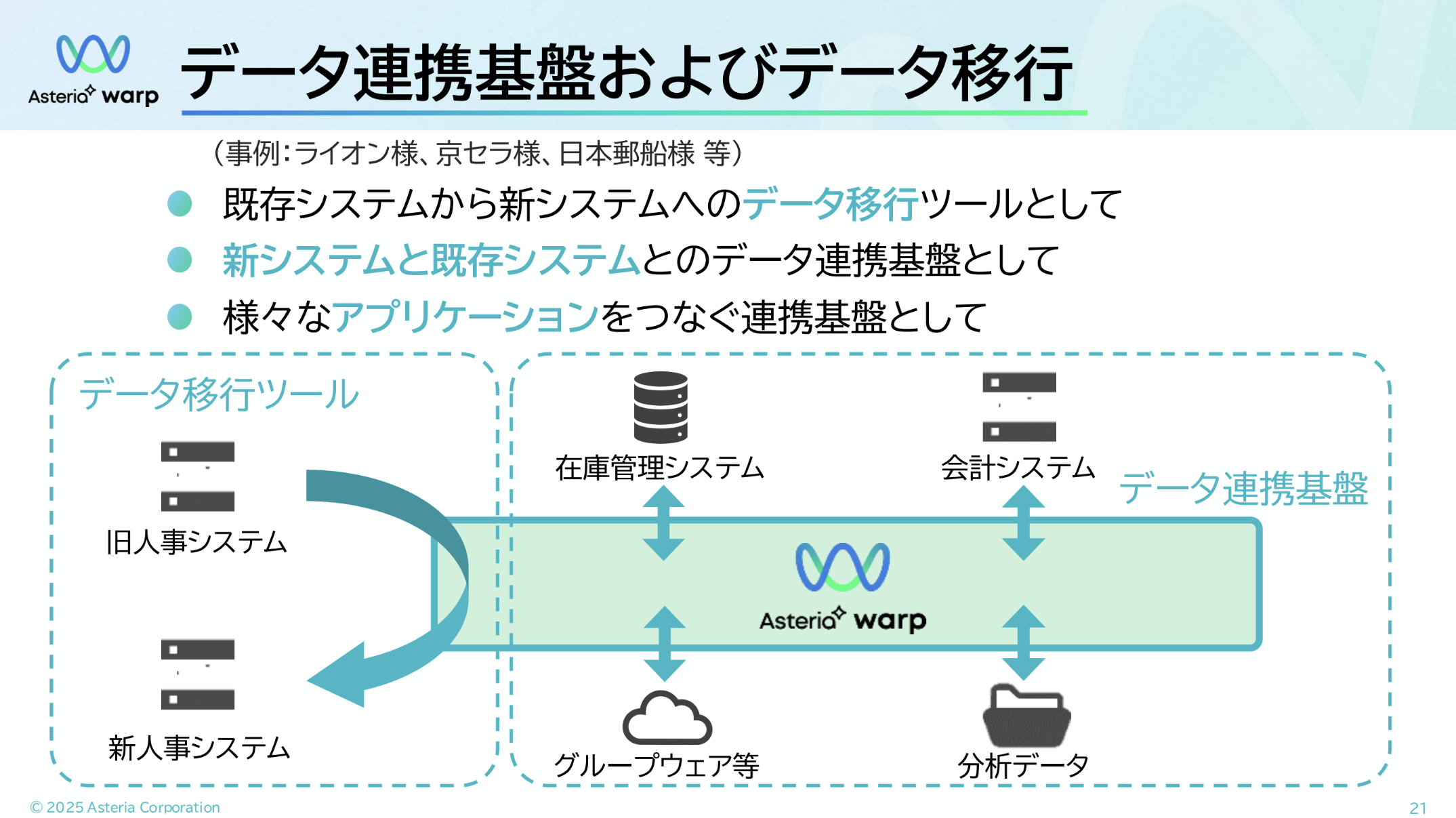 アステリアが提供する「ASTERIA Warp」は、企業の内外に散在するシステムやクラウドサービス、アプリケーション、データベースをつなげ、業務を自動化・最適化するためのノーコード型データ連携ツールである。東海林氏はその特徴を、「プログラミングなしで、IT部門以外の方でも使えます。大規模企業から中堅企業まで幅広い業種で10,000社以上に導入されており、19年連続で国内シェアNo.1 (テクノ・システム・リサーチ「2025年ソフトウェアマーケティング総覧 EAI/ESB 市場編」による)という実績からも、現場で安心して使い続けられていることがうかがえます」と説明する。