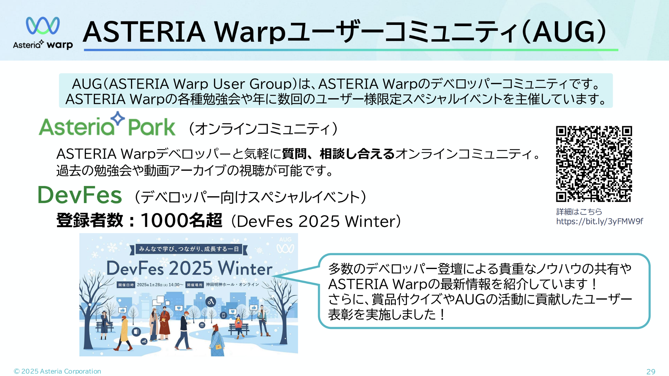 アステリアでは、ユーザーをサポートする取り組みも積極的に進めている。アステリアが運営するオンラインコミュニティ「Asteria Park」では、ユーザーやパートナーが気軽に質問・相談できる場を提供する。