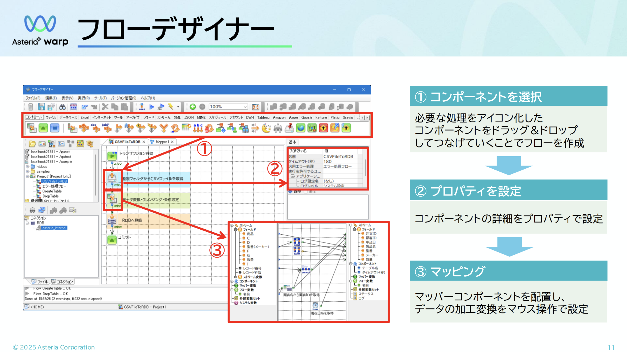 データ連携におけるノーコードの中核は、フローデザイナーと呼ばれる視覚的な開発体験にあるという。アイコンをドラッグ&ドロップして矢印でつなぐだけで、CSVの読み取りやデータ変換、データベース書き込みといった処理を直感的に構築できる。「必要最低限のアイコンで、堅牢なフローを高速に作れるようになっています」(東海林氏)。アイコンの数を少なくしているのは、「なるべくプログラミング的な発想をしなくてすむため」だという。