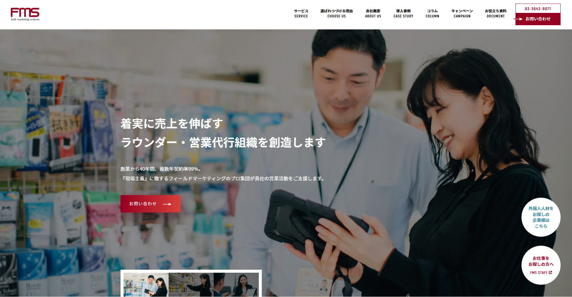 株式会社フィールドマーケティングシステムズ(FMS)の「ラウンダーサービス(BPO)」は店舗ラウンダー(店舗巡回)、スポットラウンダー、医療施設ラウンダー、営業代行、店頭調査、覆面調査、など幅広い対応が可能な営業代行サービスです。