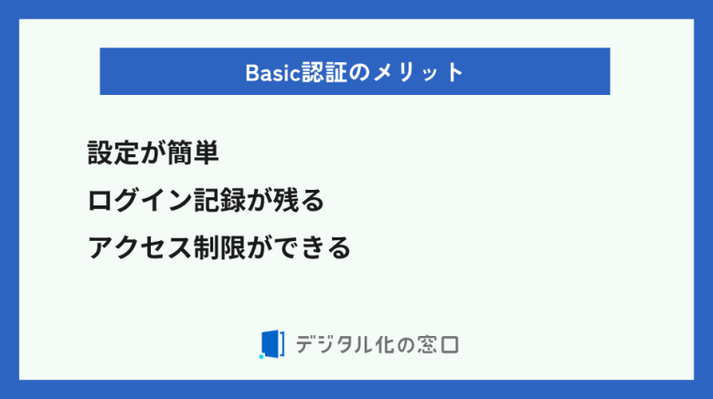 他の認証方式と比較すると、専用のログインフォームを作成したり、データベースとの連携を行ったりする必要がないため、導入の手間やコストを大幅に削減することが可能です。