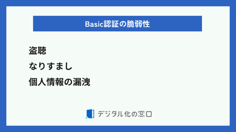 認証情報が平文で送信されるため、盗聴のリスクがあります。また、不正アクセスや個人情報漏えいのリスクも挙げられます。