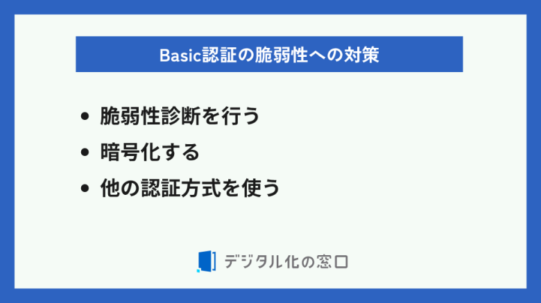A4: SSL/TLSを使用して通信を暗号化する、脆弱性診断を定期的に行う、より安全な認証方式(Digest認証やOAuthなど)に切り替えることが効果的です。