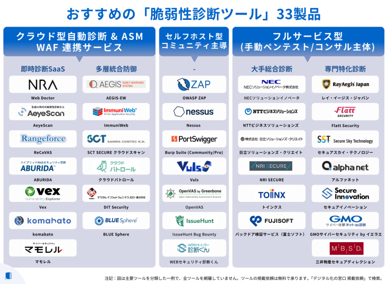 脆弱性診断ツールの比較は「脆弱性診断ツールおすすめ30選を徹底比較!無料・有料に分けて紹介」から詳細をご覧ください。