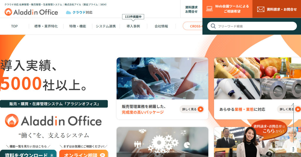 株式会社 アイルのアラジンオフィスは、中堅・中小企業を中心に5,000社以上で利用されている、販売管理・在庫管理システムです。多くの利用者の声を反映し、販売管理に必要な機能を標準搭載した完成度の高いパッケージです。ファッションや食品、化粧品や医療など、業態に応じてシステムが構成されており、業務形態に合ったシステムの運用が可能になります。
