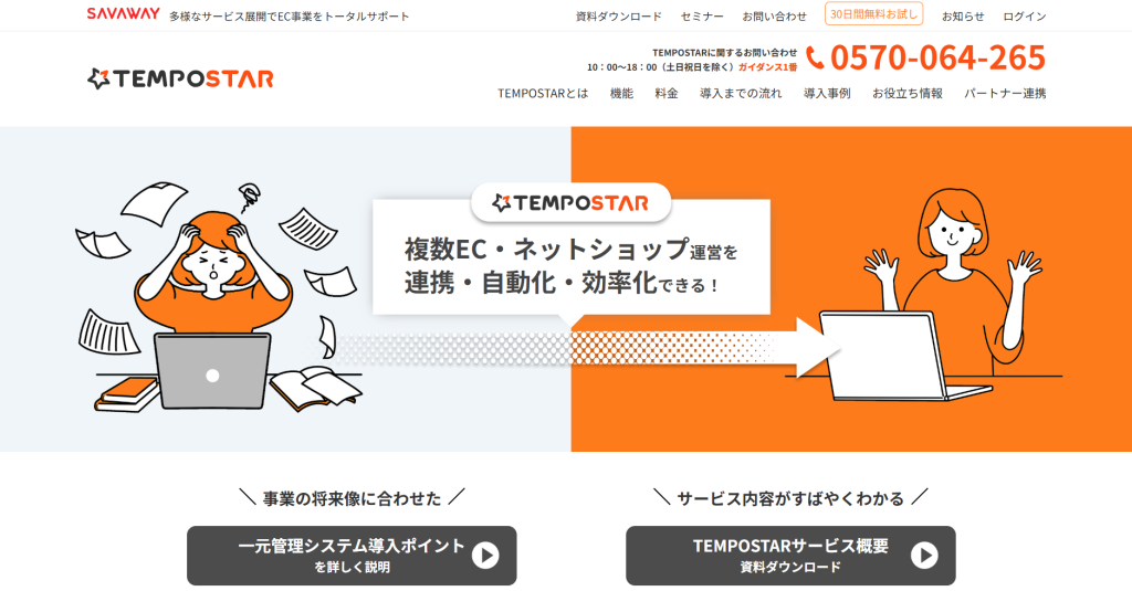 SAVAWAY株式会社のTEMPOSTARは、「やりたいこと」が「できること」へ変える、運用方法に合わせた柔軟な対応ができるECサイト向けの在庫管理システムです。手作業で行っていた管理を削減し、運用方法に合わせてシステムをカスタマイズ、機能の追加ができることが強みです。導入することで、効率化によるコストカットや在庫管理の最適化に繋がり、多店舗展開を容易に行えることで売り上げアップにつながります。初期費用も0円です。