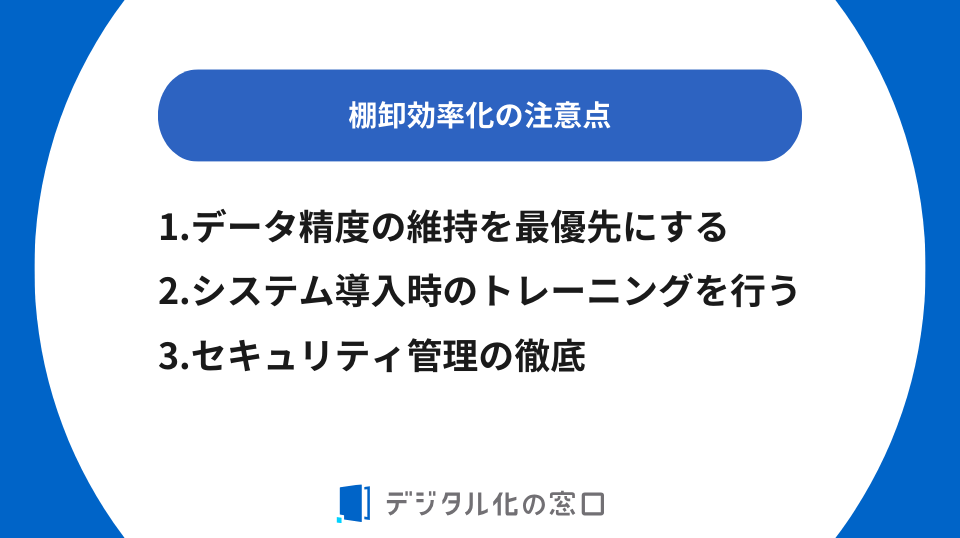 棚卸を効率化することで、作業負担を減らしつつ在庫管理の精度を向上させることができます。しかし、効率化を進める際には、いくつかの注意点を意識しないと、思わぬトラブルが発生することもあります。ここでは、棚卸効率化の際に気を付けるべきポイントを詳しく解説します。
