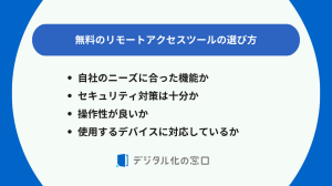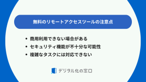 リモートアクセスツールは、場所を選ばずに業務を遂行できる便利なツールですが、無料ツールを選ぶ際にはいくつかの注意点があります。自社のニーズに合ったリモートアクセスツールを選ぶためには、必要な機能やセキュリティ対策、直感的な操作性、対応OSなどを見極めることが大切です。