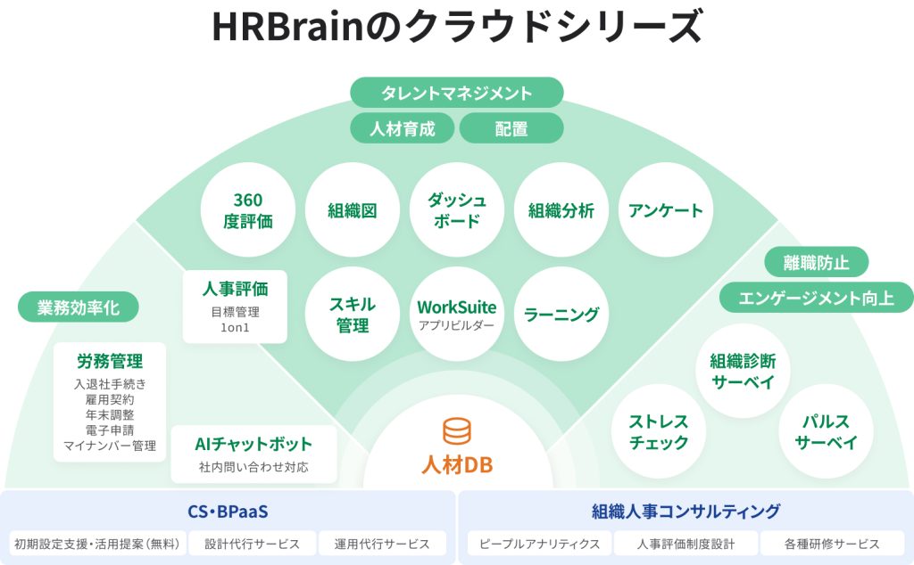 「HRBrain」シリーズは「HRBrain タレントマネジメント」をはじめとし、組織診断サーベイや労務管理など11種類のサービスからなる、人事業務の効率化から人材データの一元管理・活用までワンストップで実現するクラウドサービスだ。