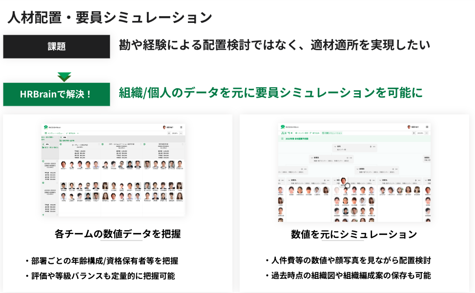 なかでも特徴的なのが、配置シミュレーション機能である。人材データをもとに組織図が自動生成され、顔写真をドラッグ&ドロップすることで、異動後の体制を視覚的にシミュレーションできる。加えて、給与データなどとも連携しており、異動にともなう人件費の増減も可視化される仕組みである。
