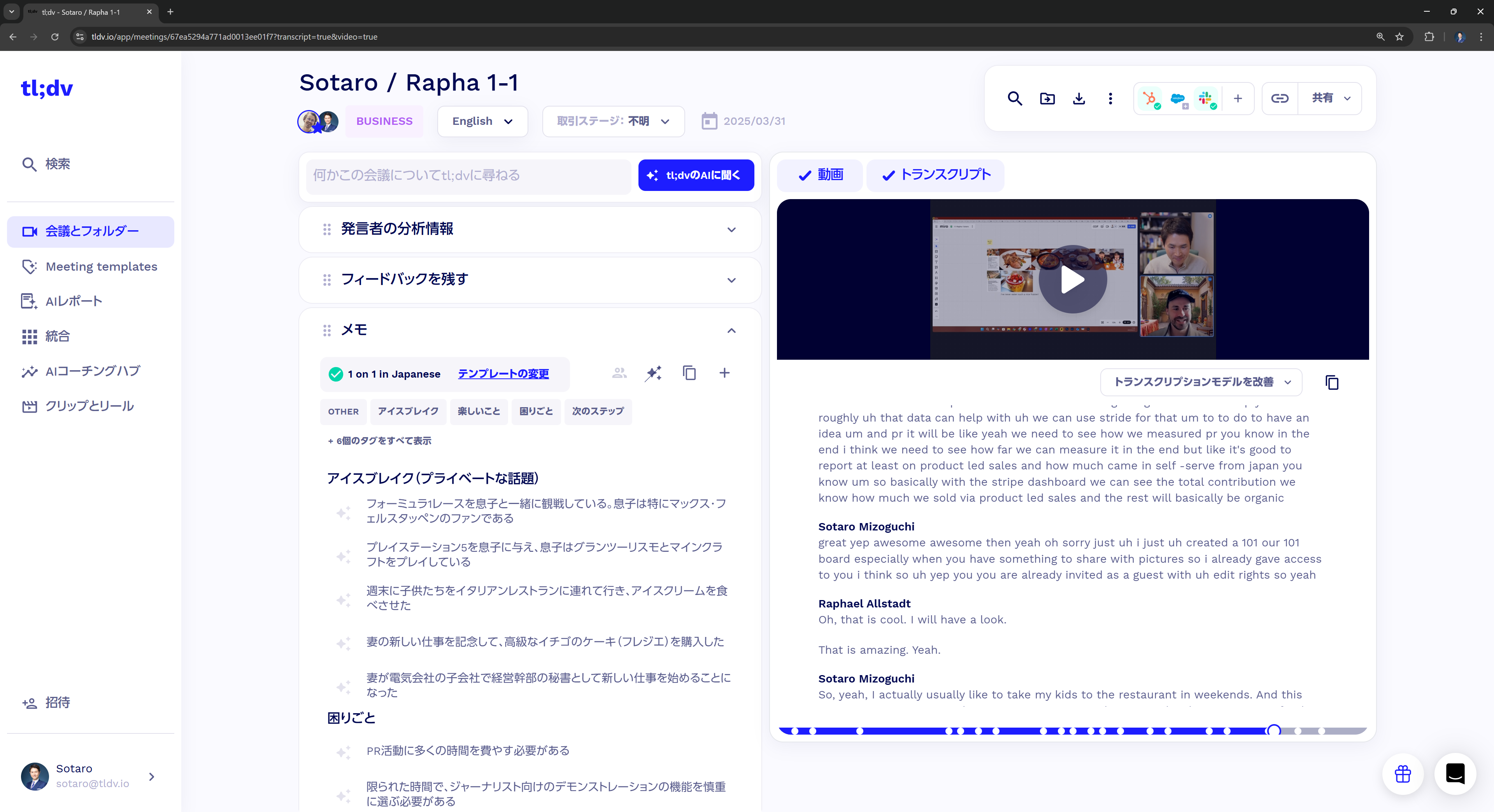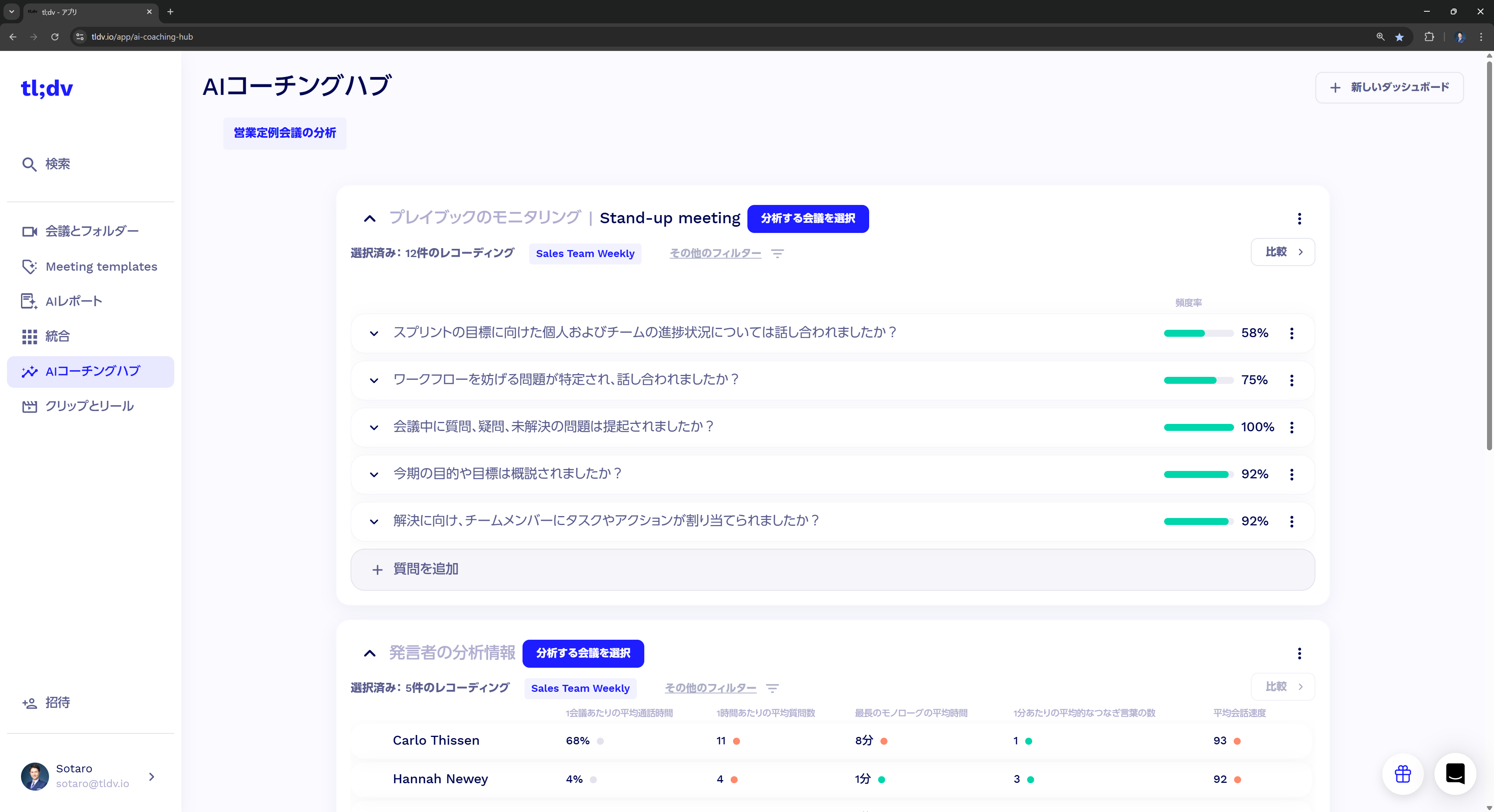 また、他社にないtl;dvの独自機能である「AI コーチングハブ」について説明する。AIコーチングハブは、会議を分析し、個人やチームパフォーマンス、コミュニケーションスキル、会議効率性を高めることを目的にした機能だ。「例えば、定例会議のなかで、誰がどれくらい発言しているのかを分析したり、1時間あたりに誰が何回くらい質問をしたのかなどを抽出してくれます。さらに、個々の会話の発言時間や会話のスピードなども計測してくれるので、話が単純明快で分かりやすいかどうかなどの評価にも生かせます。会議そのものの質を分析することもできるので、会議の生産性を上げるのに役立ちます」(溝口氏)