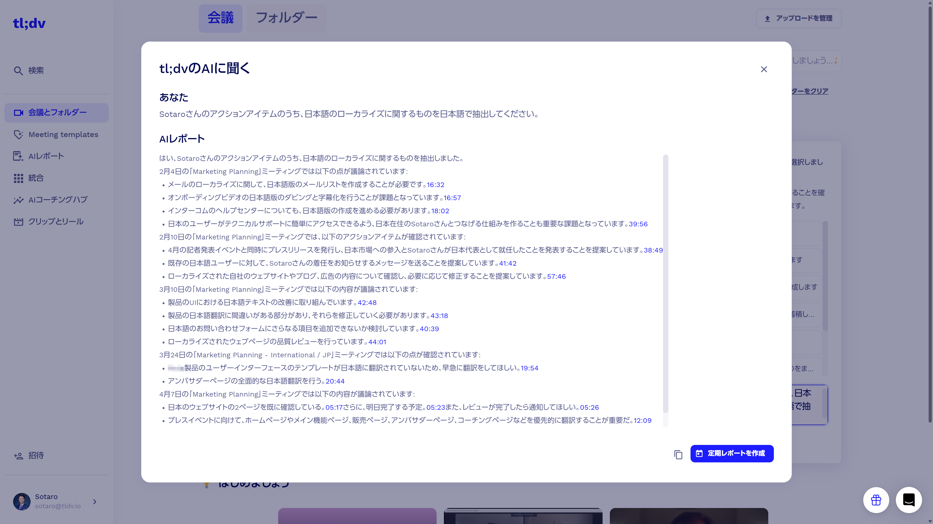 もう一つ、溝口氏がtl;dvの有効な活用事例として紹介したのが、AIジェネレーターを活用した定期レポートだ。この機能は、どういうシーンにおいて役立つのだろうか。「通常、定例会議は各部門単位で行われていると思いますが、例えば営業チームの会議の中で、この調査はすぐにマーケティングチームにやってもらった方がいいよね、といった会話も出てくるでしょう。しかし、営業チームの会議の議事録をマーケティングチームが見ることはないと思います。そんな時に、営業チームの会議を対象に、AIジェネレーターでマーケティングチームのアクションアイテムを抽出してもらい、毎週会議後にToDoリストとしてマーケティングチームに送るように設定できます。このように同期コミュニケーションである会議を非同期に活用することで、会議に必ずしも参加しなくても、異なる部門間や全社のコミュニケーションを加速させることになります」(溝口氏)
