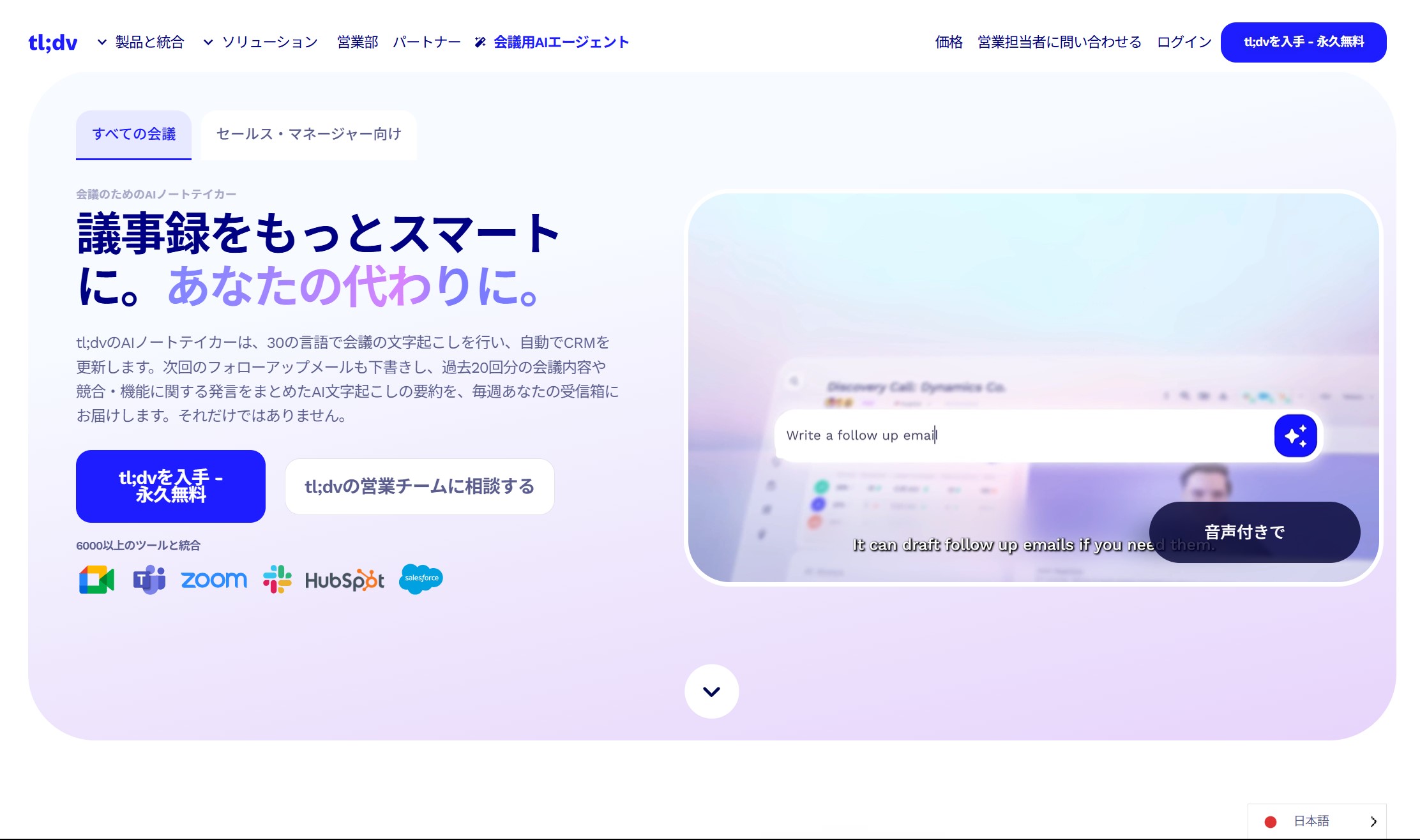 AIを活用した様々なツールやソリューションが、連日話題になっている。中でも、我々の仕事を確実に効率化してくれそうなのが、AIによる議事録自動作成ツールだ。実際に人が会議室などに集まって行うリアル会議からオンラインで行うリモート会議まで、AIが出席者の発言をテキスト化し、議事録にまとめてくれる。だが、tl;dvのAIミーティングアシスタントが提供するメリットは、それだけにとどまらない。会議中の発言から重要なポイントを抽出したり、会議内容を短い動画クリップに編集してくれるなど、会議の内容を効率的に業務に活用できるよう支援してくれるのだ。さらに面接官や営業パーソンの言動など、動画を分析することもできるので、活用の範囲が大きく拡がっている。同社の日本でのビジネスを統括する溝口宗太郎氏に聞いた。