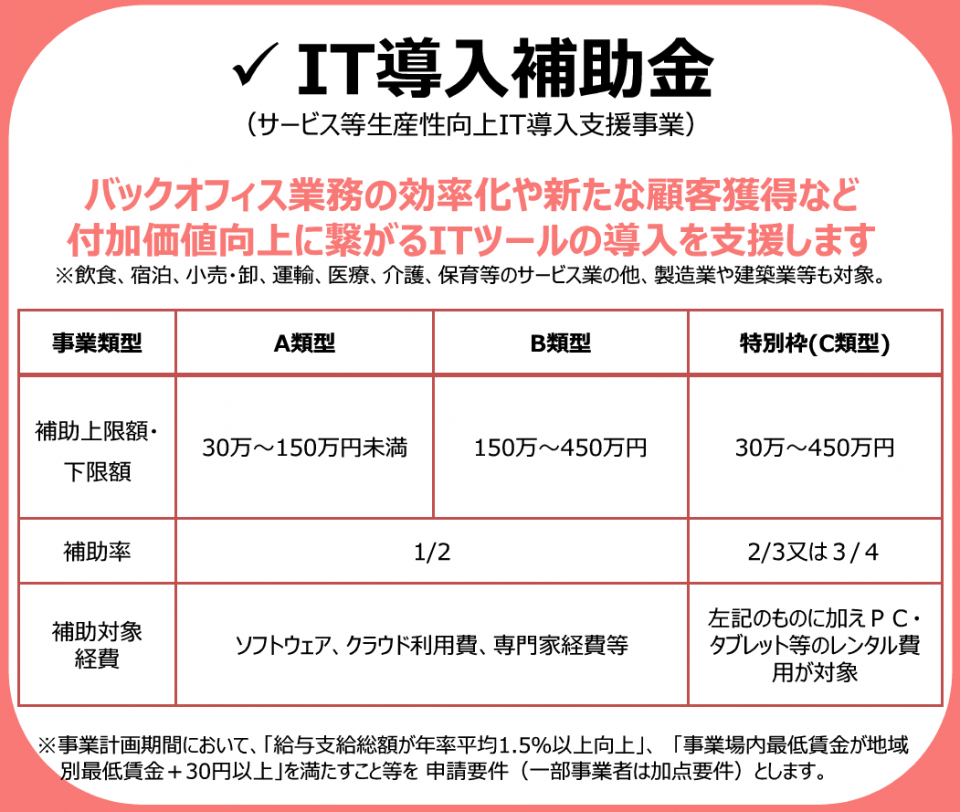 IT導入補助金の対象となる製品(freee請求書、マネーフォワード、楽楽明細など)があります。最大で導入費用の2/3が補助されます。