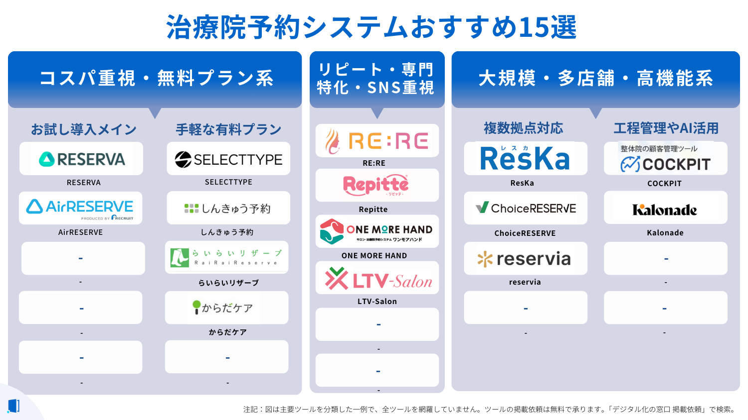 - 予約フォームの項目追加や、複数店舗切り替え、Googleカレンダー連携など、基本機能に加えカスタマイズ性を向上しています。中小企業向けに最適です。
