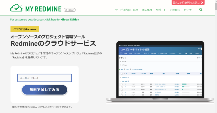 - 6,000円/月(ユーザー数10、プロジェクト数100、ストレージ2GB)