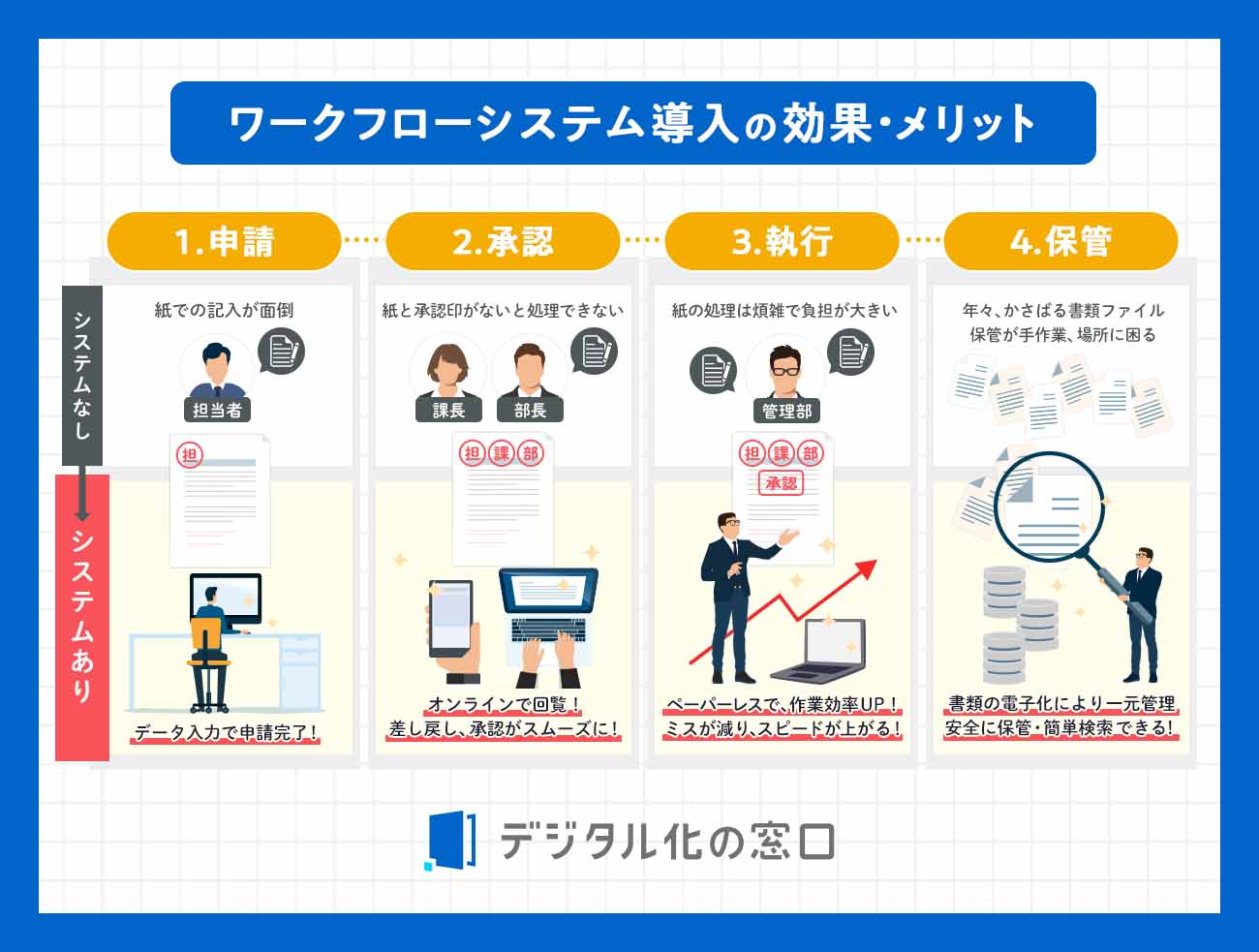 申請のスピードアップ、ペーパーレス化の実現、業務の可視化による無駄の削減、などがあります。電子帳簿保存法への対応も可能です。セキュリティやコンプライアンスの強化、内部統制の強化も可能です。また、リモート環境でも業務を進められるため、柔軟な働き方にも対応できます。