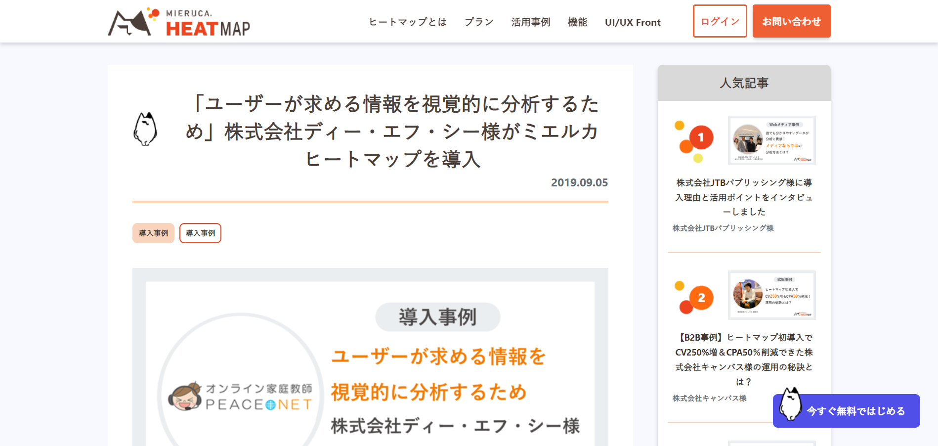 ボタンの色やテキストの内容など、どのパターンが最もコンバージョンの増加に効果的か同時でテストできます。ミエルカヒートマップでは専任のコンサルタントによるABテストの設計支援が無料で付属しているのも特徴です。